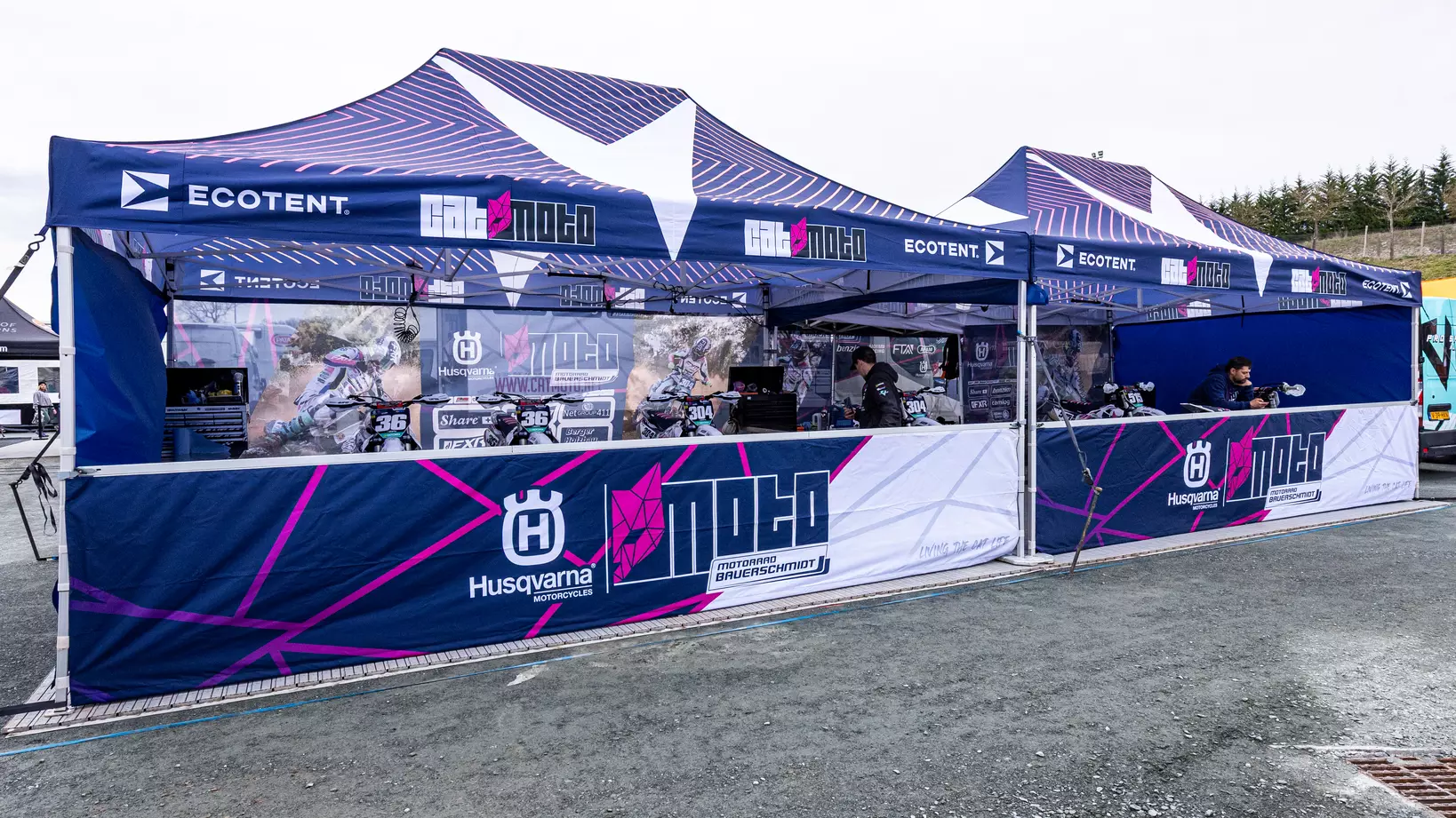 Cat Moto Motocross Team with two Ecotent pop-up gazebos at a European race paddock.